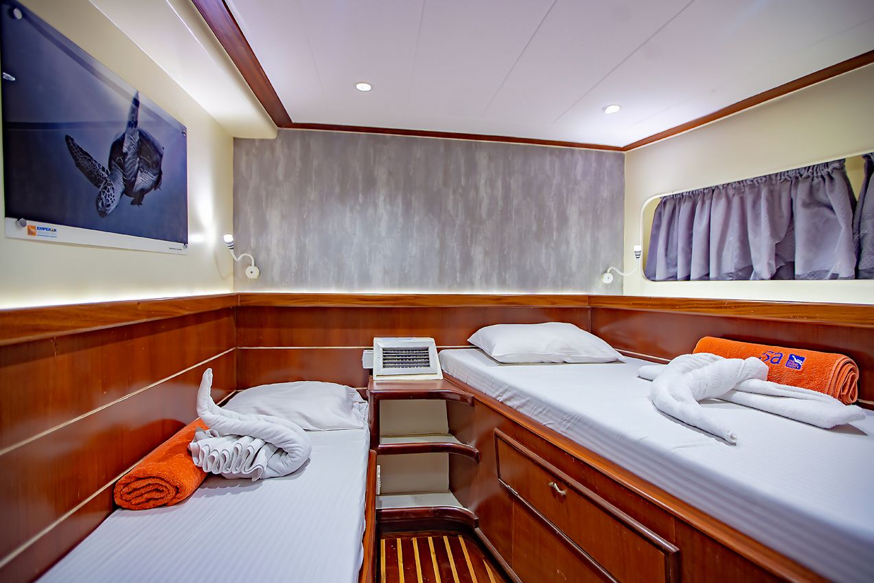 Die Emperor Asmaa bietet Platz für 18 Personen in 9 Doppelkabinen mit je 2 Einzelbetten, Klimaanlage und eigenem Bad: 5 auf dem Unterdeck (ca. 7 bis 9 m²) mit Bullaugen, sowie 4 auf dem Oberdeck (9 m²) mit großen Fenstern.