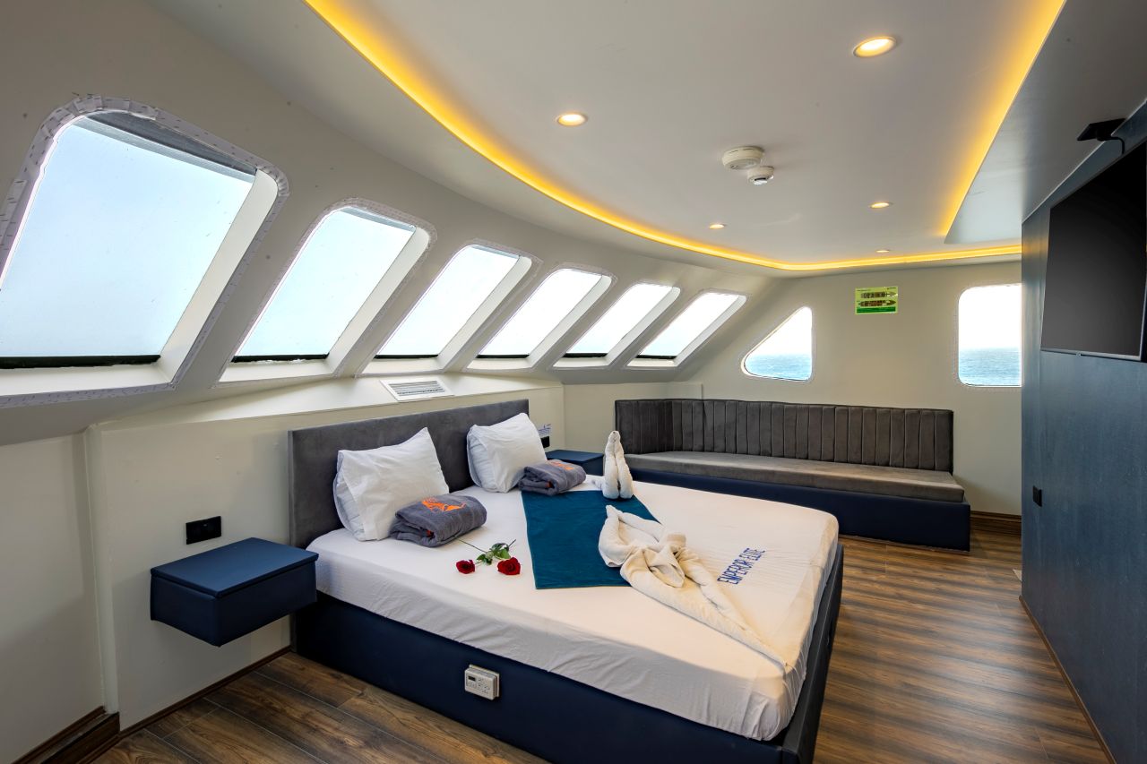 Die Gemeinschaftsbereiche laden ein mit: klimatisiertem Salon & Essbereich, bequemen Sofas, 55″ LCD-Smart-TV, 2 Bars, Tauchdeck und Tauchplattform, einem Sonnendeck, sowie einem Tauchdeck mit 6,5 m x 8 m großer Plattform und 3 Bauer-Kompressoren unter Deck, sowie einem Tauchboot 2 Zodiac 40 PS