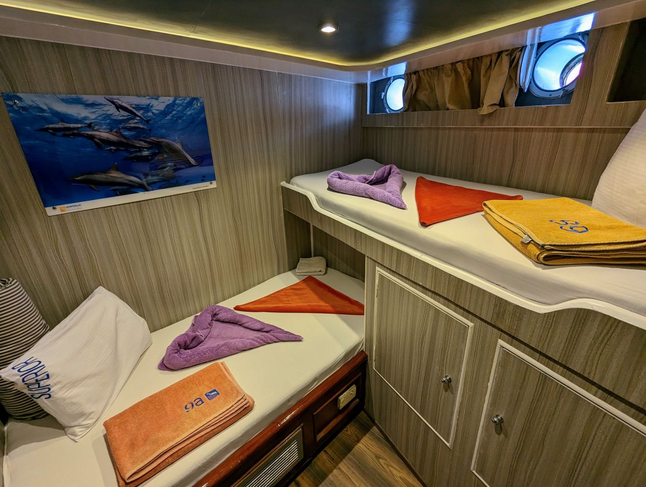 Tauchen: Viele Route bieten mehr als 21 Tauchgänge pro Reise an. Das Tauchdeck hat individuelle Bereiche zum Aufbewahren der Ausrüstung und viel Platz für jeden Taucher um sich fertig zu machen sowie zwei Beiboote, die den Zugang zu den Tauchplätzen ganz einfach machen.