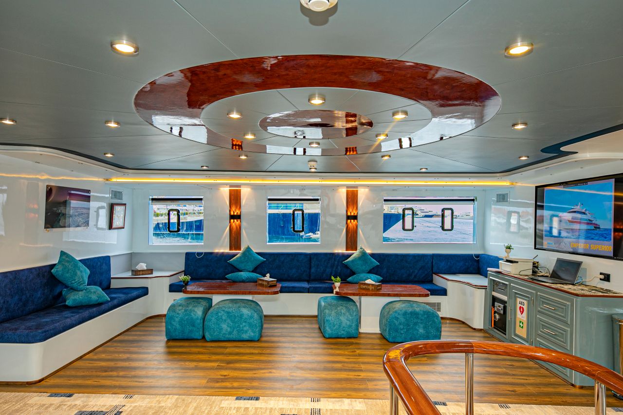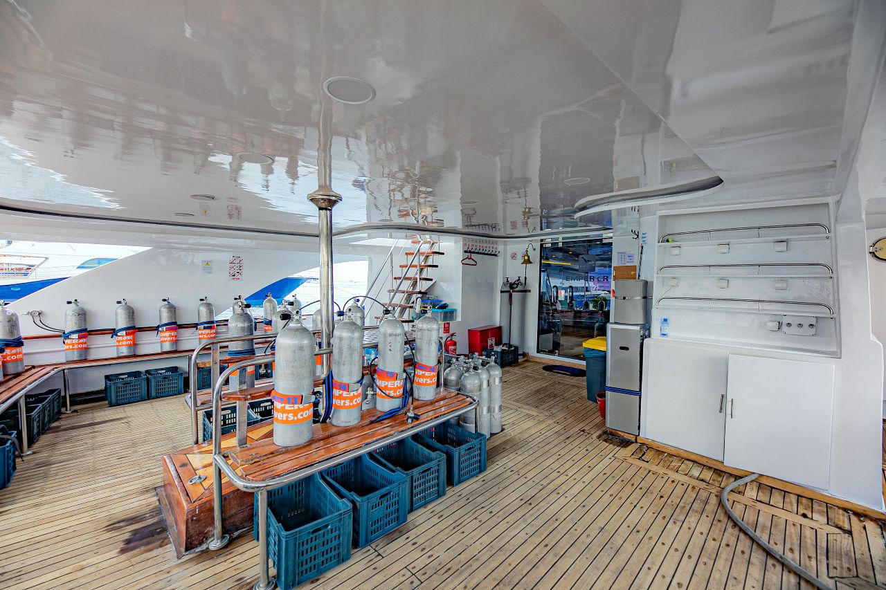 Zur Ausstattung des Schiffes gehören ein Klimatisierter Lounge-/Essbereich mit bequemen Sofas, ein Fernseher mit USB-Anschluss, 2 Bars, ein geräumiges Tauchdeck mit 7 x 7m großer Tauchplattform, sowie 3 Bauer-Kompressoren unter Deck, ein Sitzbereich im Freien mit Liegestühlen und ein Sonnendeck.